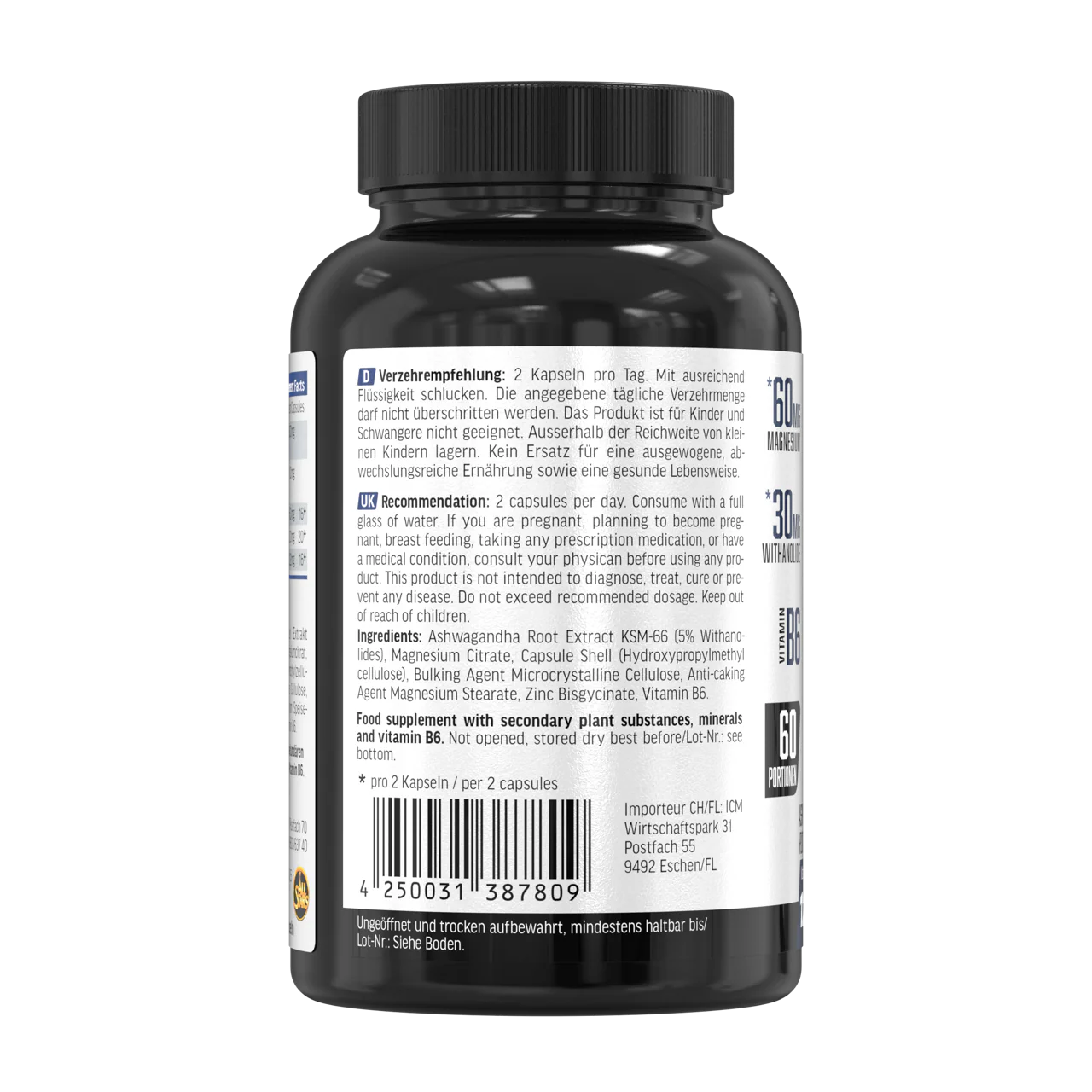 - 600 mg hochwertiges KSM-66® Ashwagandha (enthält 30 mg Withanolide je Portion (2 Kapseln))