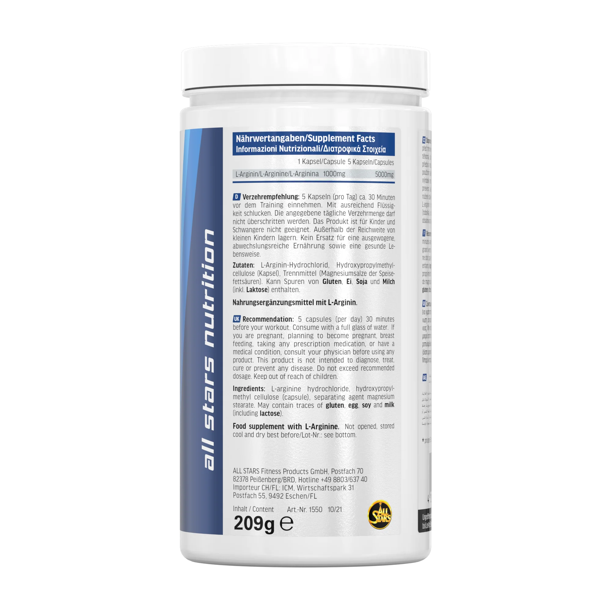 Eine Portion aus 5 Arginin Mega Caps enthält 5000mg L-Arginin (als L-Arginin-Hydrochlorid), dazu nur die Bestandteile der Kapselhülle (gelatinefrei) und ein Trennmittel. 150 Kapseln pro Dose ergeben eine Monatspackung.