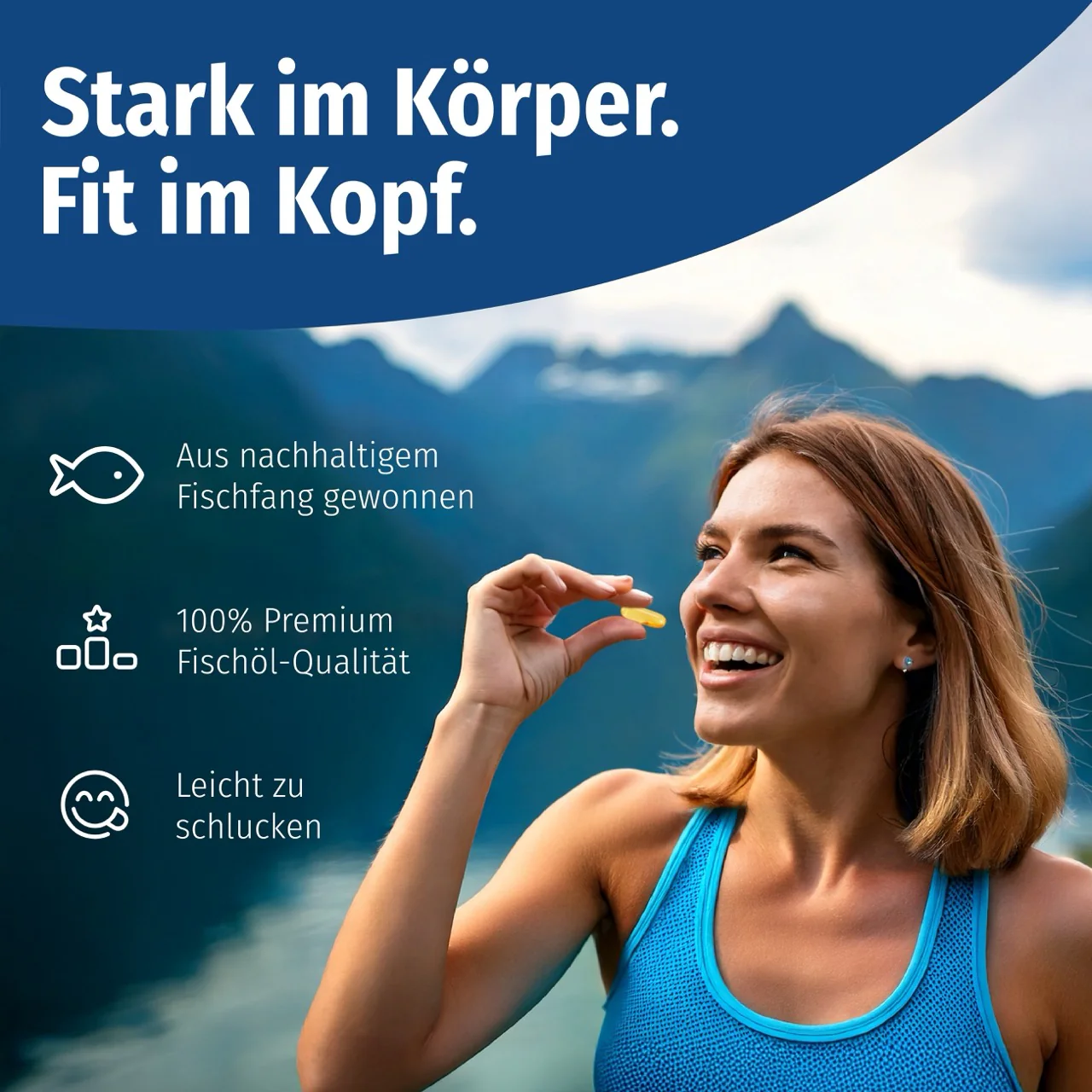 Wertvolle Omega-3 Fettsäuren, gewonnen aus Fischöl und mit 540mg EPA und 360mg DHA je Tagesdosis aus 3 Kapseln.